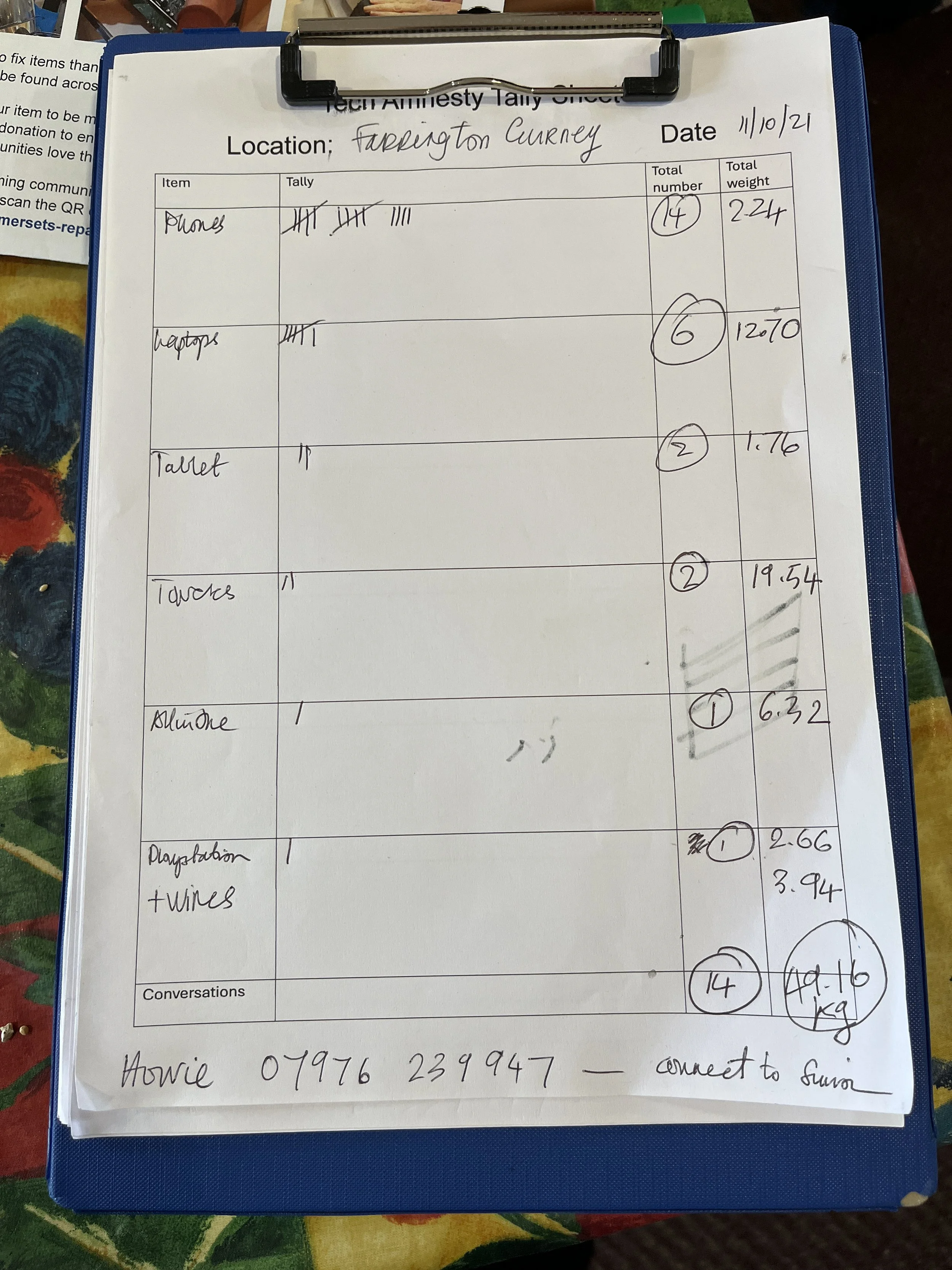 LINDA HULL was the delighted by her haul: 49.16 kilos of digital waste. All the devices, bits and pieces will now be taken apart and either repaired and given to those who need it (repairing the digital divide) or it will be recyled. Nothing will go to landfill. This is terrific news for everyone and we are grateful to Linda for crossing the Somerset boundary to visit us.